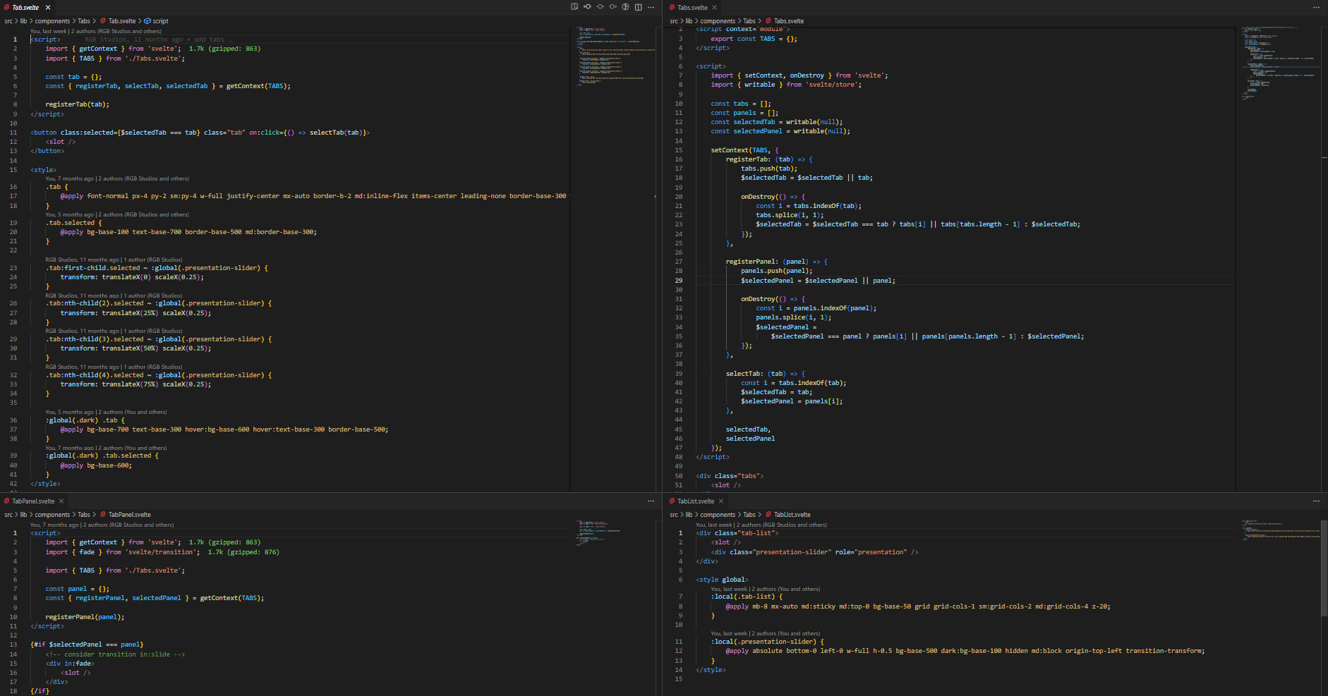 I couldn’t find any good examples of tab components in Svelte that weren’t either unnecessarily complex (involving multiple files, dozens of lines of CSS, getting and registering context and writables) or just hard coded and involving too much copy-paste boilerplate code to use every implementation.