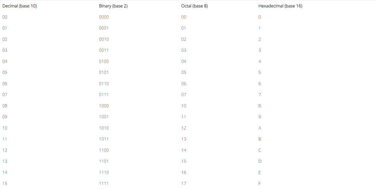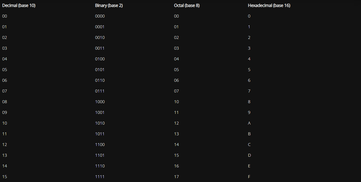 Decimal (base 10) | Binary (base 2) | Octal (base 8) | Hexadecimal (base 16) |